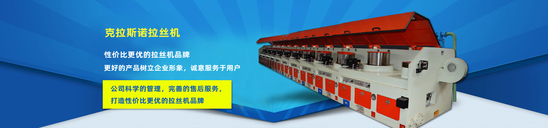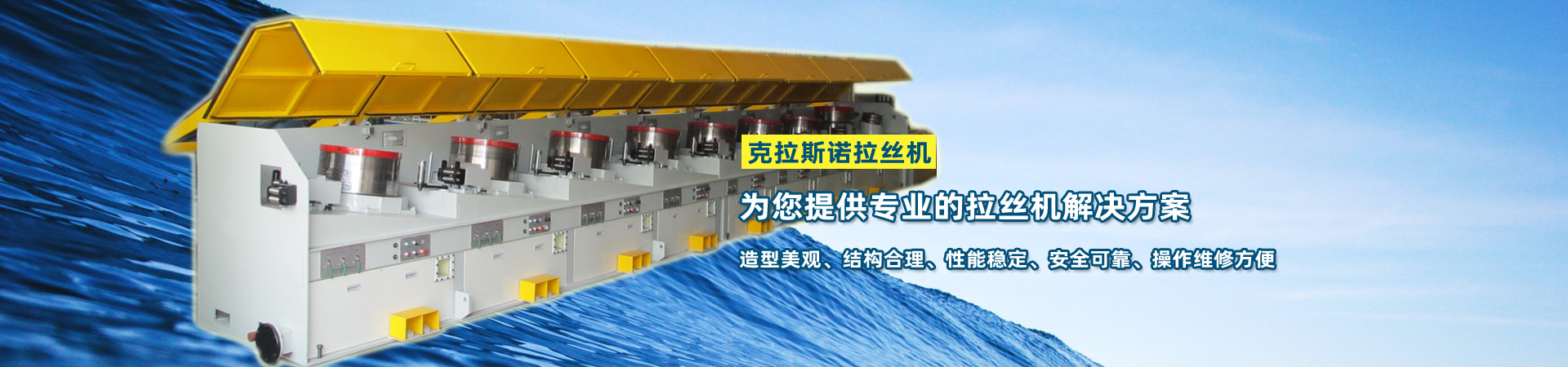公司主要產(chǎn)品有:直進(jìn)式拉絲機(jī)系列、水箱式拉絲機(jī)系列、倒立式拉絲機(jī)系列、快速滑輪式拉絲機(jī)系列、倒立式收線(xiàn)機(jī)組、盤(pán)條預(yù)處理生產(chǎn)線(xiàn)以及象鼻式卸線(xiàn)機(jī)、工字輪收線(xiàn)機(jī)、軋尖機(jī)、吊線(xiàn)機(jī)等輔機(jī)系列產(chǎn)品。公司的所有設(shè)備技術(shù)先進(jìn),實(shí)用性強(qiáng),特別是倒立式拉絲機(jī)為臺(tái)灣技術(shù),深受客戶(hù)好評(píng)。適用的范圍有低、中、高碳素鋼絲、輪胎鋼絲、不銹鋼絲、簾線(xiàn)鋼絲、膠管鋼絲、焊絲、電線(xiàn)電纜用銅絲、鋁絲、異型鋼絲等等。
